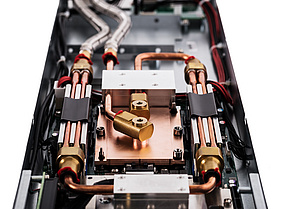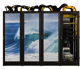 CooLMUC-3 took the next step in improving energy efficiency. Via the introduction of water cooling for additional components like power supplies and network components, it was possible to thermally insulate the racks and virtually eliminate the emission of heat (only 3% of the electrical energy) to the server room.