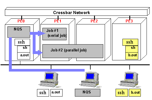 Benutzer können sich mit SSH (Secure Shell) oder SCP (Secure Copy) mit jedem PE verbinden, das für interaktiven Zugang konfiguriert ist. Dies sind am LRZ die 5 IMPEs und das primäre PE. Stapelaufträge werden mit NQS verwaltet, welches auf dem primären PE läuft. Die Zuteilung von NQS-Jobs zu PEs erfolgt in Abhängigkeit von den angeforderten Betriebsmitteln durch das PMS (partition manager system). Benutzerjobs können ein PE exklusiv (simplex mode) oder zusammen mit anderen Jobs nutzen (shared mode). Die exklusive Nutzung von PEs ist am LRZ nur für Paralleljobs vorgesehen (paralleler Pool, s.u.)