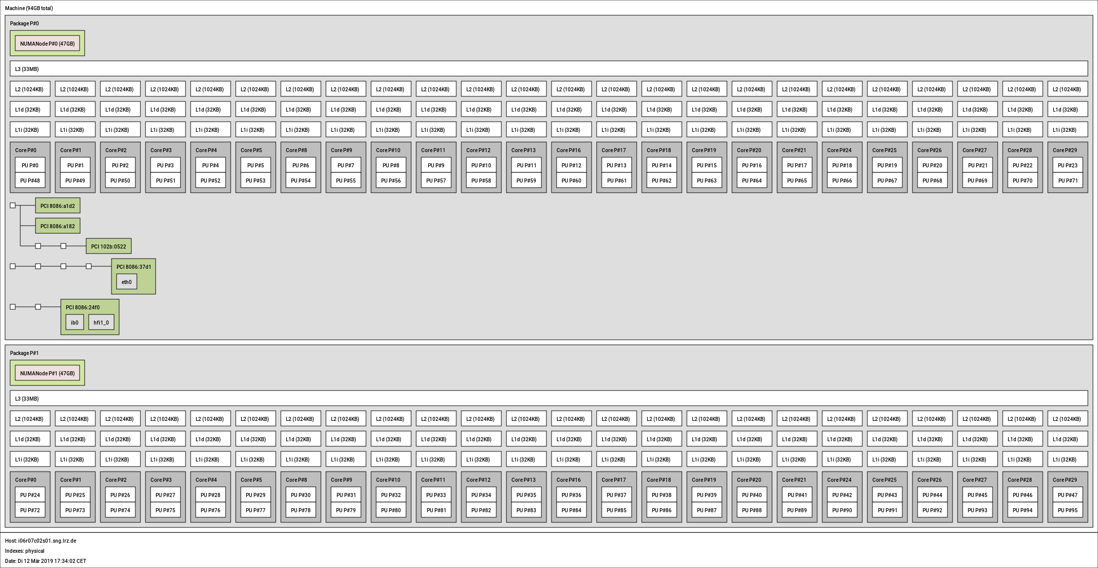 The processor SKU used in SuperMUC-NG is a 24 core model dubbed Intel® Xeon® Platinum 8174. It supports both a 205 and 240W operational TDP mode; in regular operation however only the former is used, due to energy usage constraints.