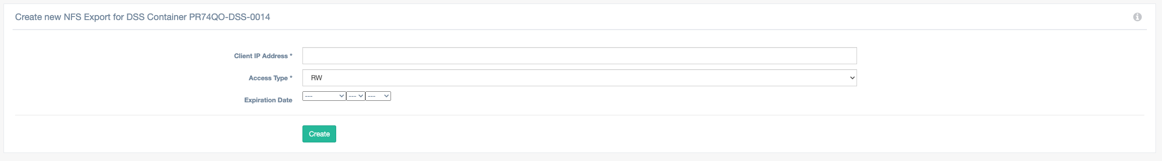 Login to DSSWeb and navigate to the DSS Container you want to expose data via NFS. Scroll down until you see the NFS Export section. Click on + create new export