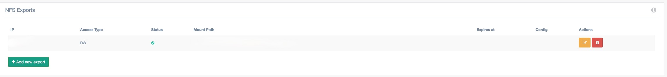 You should see a new line in the NFS Export section with a spinner, indicating the ongoing creation of the export. After the spinner cleared the export is ready. Copy the Mount Path