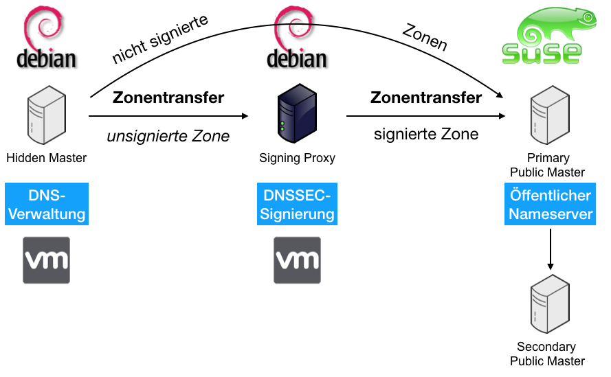 Wie durch das Leibniz-Rechenzentrum empfohlen, und auch dort so verwendet, wird die Schlüsselverwaltung und DNSSEC-Signierung auf einem sogenannten "Signing Proxy" durchgeführt. Dieser übernimmt die unsignierten Zonendaten per Zonentransfer von einem als DNS-Verwalter, der sogenannte "Hidden Master", fungierenden Nameserver. Sowohl der Signing Proxy, als auch der DNS-Verwalter wurden auf VMWare als Virtuelle Maschine installiert. Da die physischen Server als einzige autoritativ sind, und vom öffentlichen Internet erreichbar sein müssen, können die beiden Virtuellen Maschinen auf internen IPs laufen, und abgesichert werden. So ist ein Zugriff auf die geheimen, privaten DNSSEC-Schlüssel erschwert.