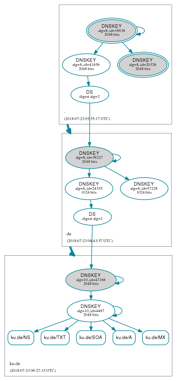 Nach einigen Stunden wurde der KSK durch den DFN im DS-Eintrag der .de-Zone eingetragen, und die vollständige DNSSEC-Signierung inklusive der sicheren Delegation über den DS-Eintrag konnte mit DNSViz.net für die ku.de-Domäne überprüft werden: