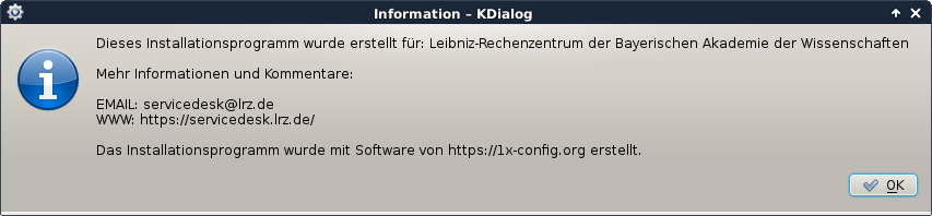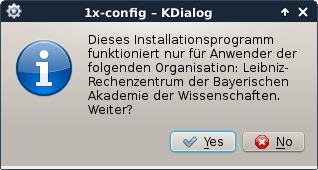 Das Skript führt sie durch folgenden Dialog (siehe Screenshots unten) und legt dabei einen Ordner ~/.1x-config und, wenn möglich, eine WLAN-Profil-Datei für den Networkmanager an (Datei mwn-events im Ordner /etc/NetworkManager/system-connections). Wurde das Profil erfolgreich installiert, ist die WLAN-Verbindung über mwn-events verfügbar, solange der angegebene WLAN-Benutzername aktiv ist.