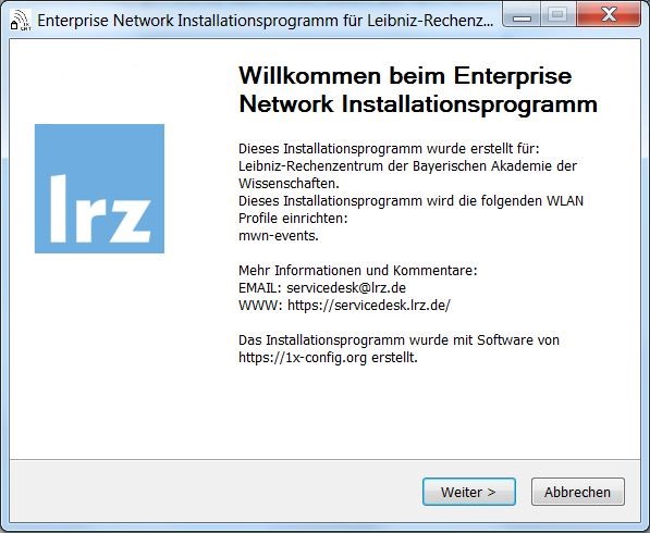 Das Tool kann über eine Verbindung mit der SSID lrz unter https://doku.lrz.de/konferenz-wlan-mwn-events-10745886.html geladen werden.
