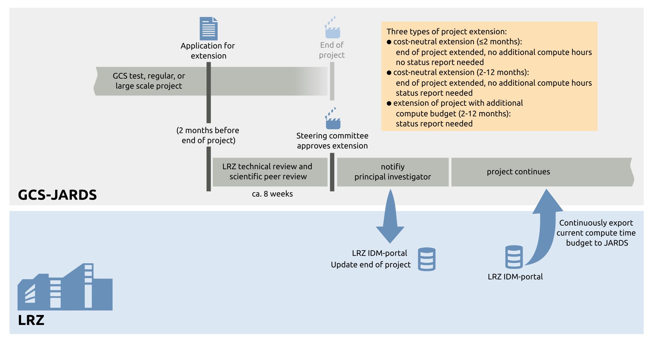 The image shows the process of extending a GCS regular, large scale, or test project on SuperMUC-NG. All applications for projects on SuperMUC are managed through the GCS-JARDS tool, hosted by GCS, the Gauss Centre for Supercomputing. GCS-JARDS is used to manage the review process, collect status reports, final reports, dissemination material, and to manage project extensions.