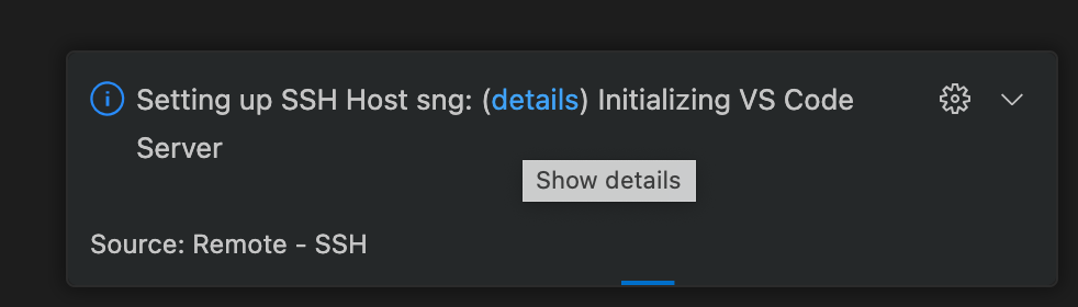 Once VSCode starts connecting, a small window like this pops up on the bottom right corner. In case the connection takes too long to be established, you can click here on details and take a look at the logs: