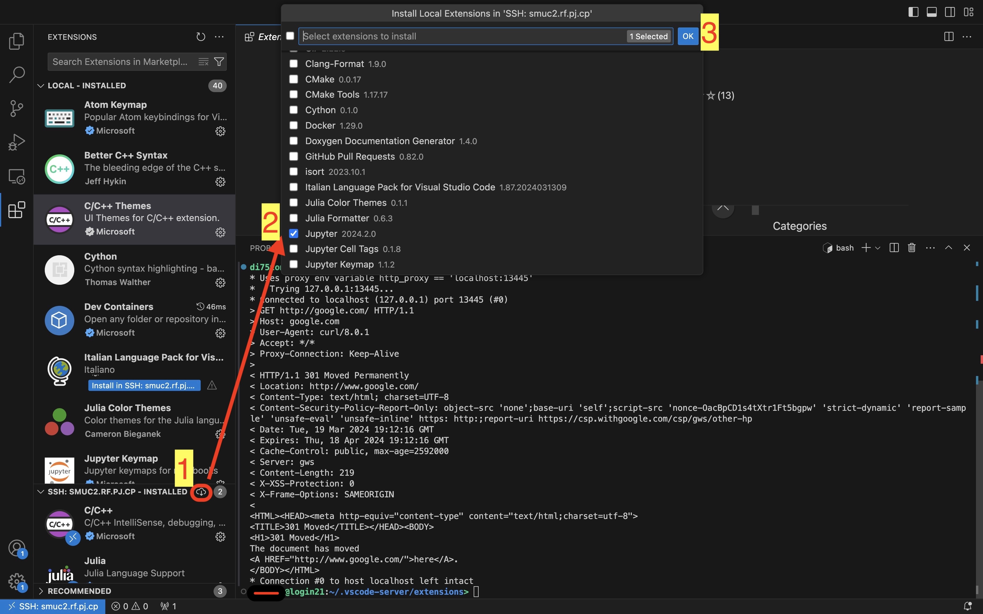 2. run the scp command shown in the previous log line, e.g. : $ scp -o ConnectTimeout=15 'vscode-server.tar.gz' 'vscode-server.tar.gz.done' phase2:'/dss/dsshome1/08/di75tom/.vscode-server/bin/384ff7382de624fb94dbaf6da11977bba1ecd427'