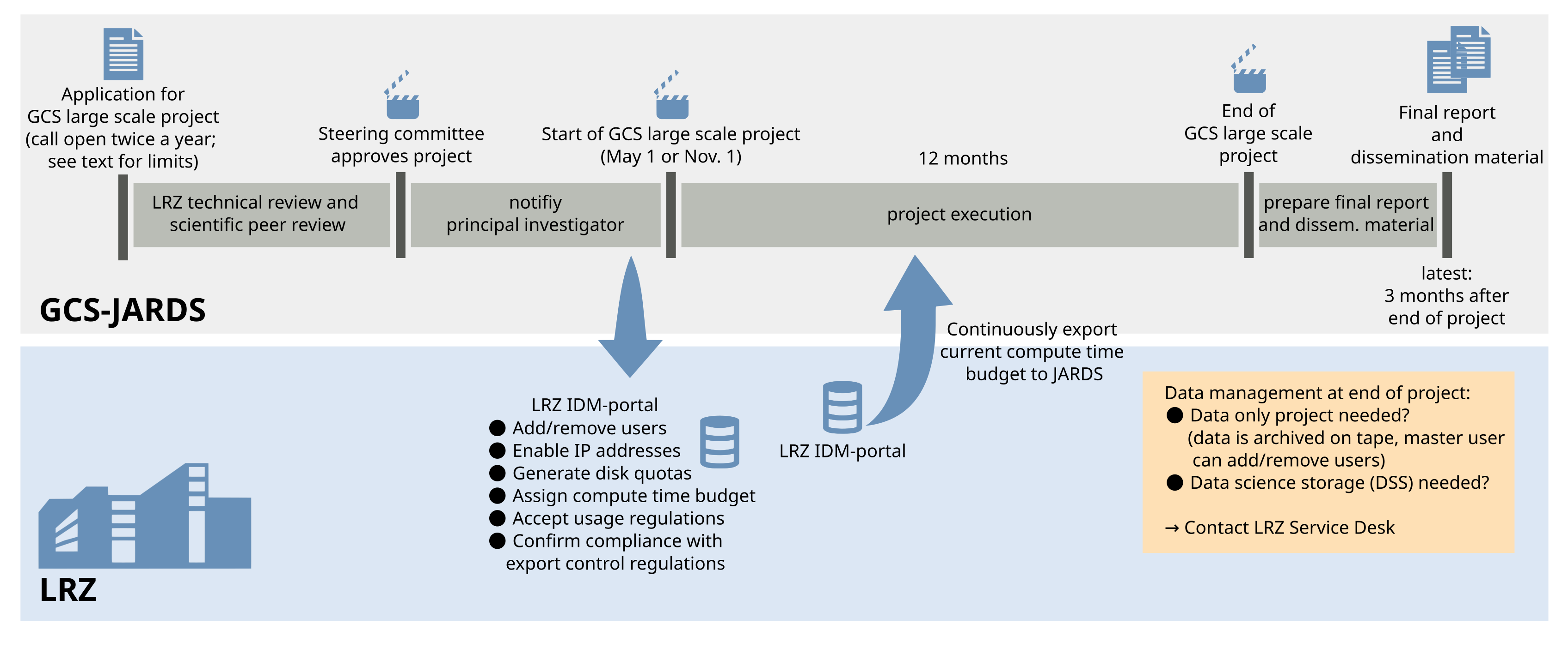 Twice per year, the Gauss Centre for Supercomputing GCS issues a Call for Large-Scale Projects, usually at the end of winter and at the end of summer.