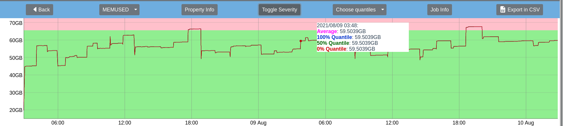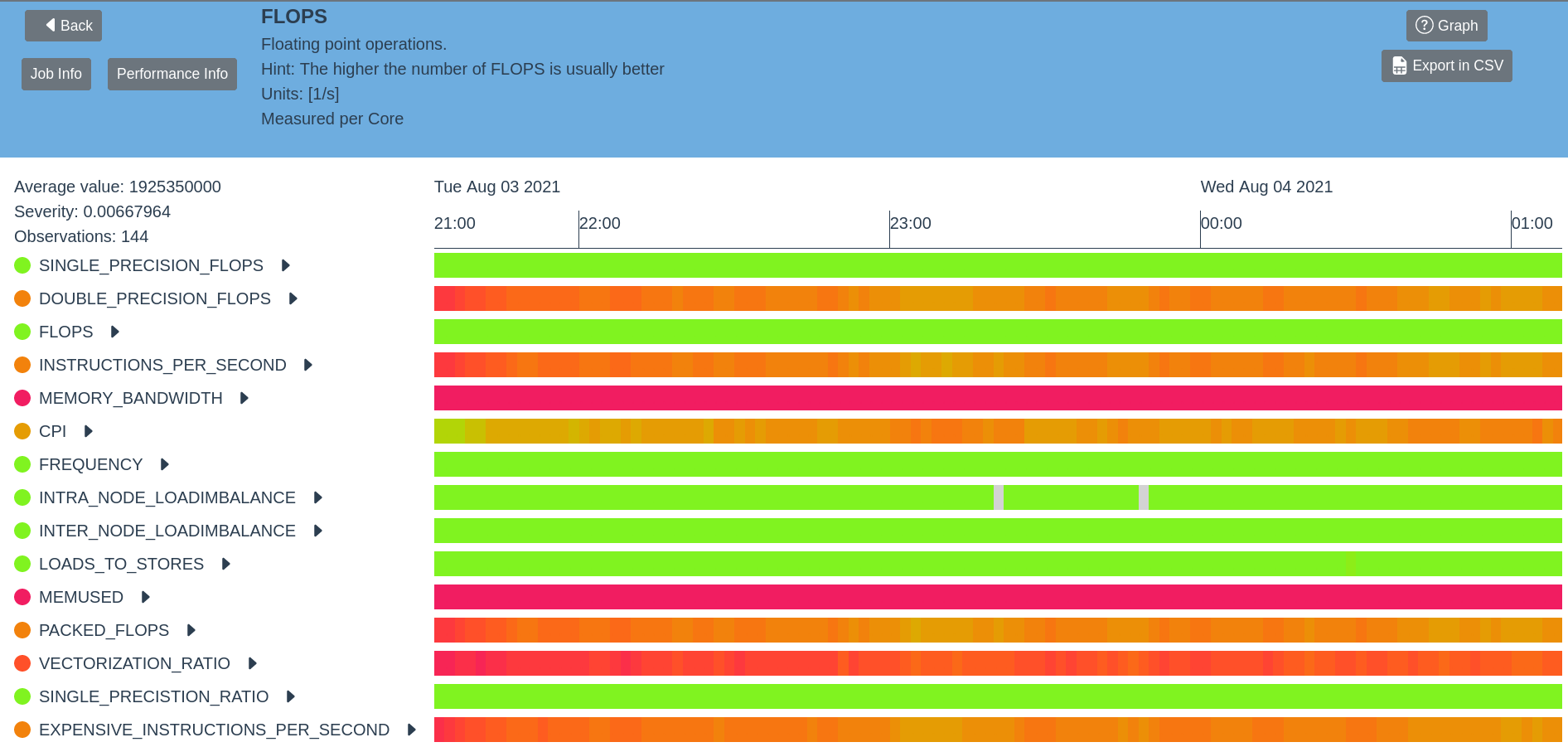 The header of the performance average table shows the metrics, which we will call properties hereafter. The table shows a job per row and the average severity of its collected properties. The severity ranges from 0 to 1, and the averaged value is shown on the table cell. The performance is considered "good" when the severity is 0 or "bad" when the severity is 1 and is coded in color from green to red respectively. Note that this classification is only a hint that optimization is needed. Depending on what the job does, it might not be possible to optimize the job.
