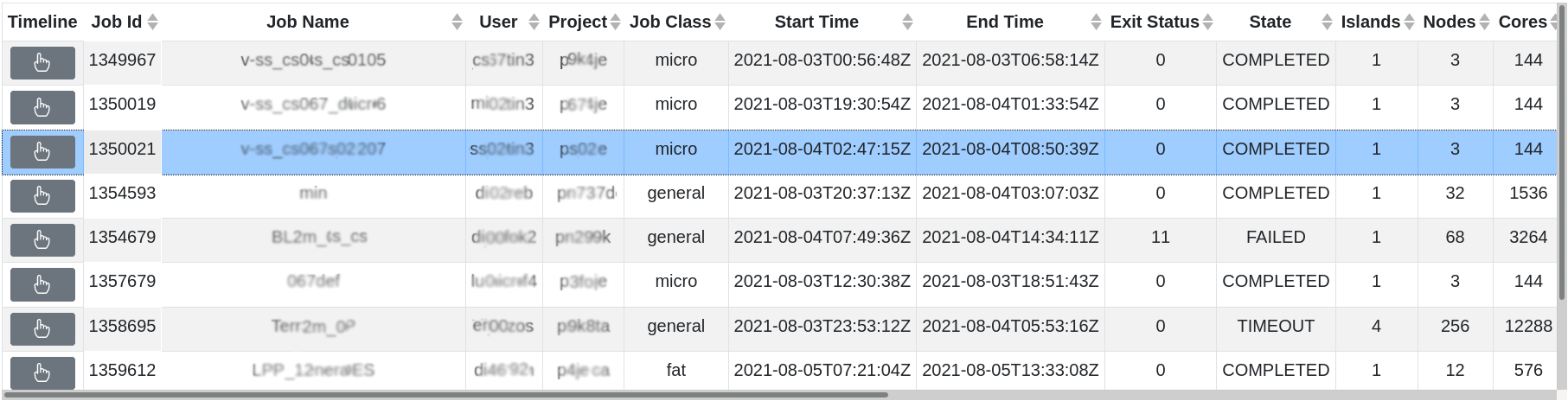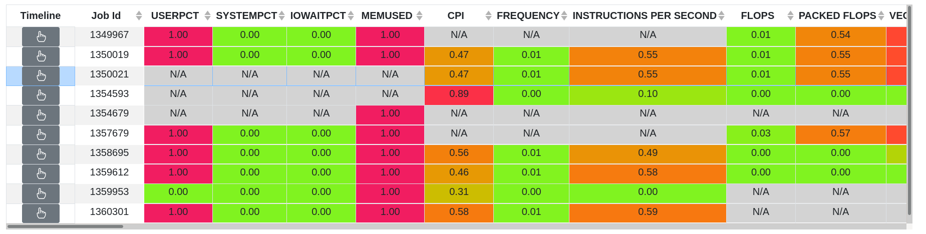 - Click on the Timeline column to go to the Timeline View for the corresponding job. Note that jobs with no performance data will have this button disabled.