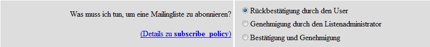 Falls sich Interessenten selbst ein- und austragen können sollen, klicken Sie auf "Abo-Regeln und Adreßfilter..." und wählen dort bei "Was muss ich tun, um eine Mailingliste zu abonnieren?" die Option "Rückbestätigung durch den User" (also keine Genehmigung durch den Listen-Administrator):