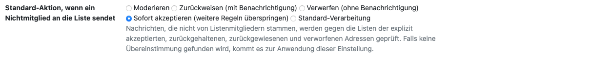 - Klick auf "Nachrichtenakzeptanz", und dort Überprüfung der Einstellung bei "Standard-Aktion, wenn ein Nichtmitglied an die Liste sendet". Diese sollte wie folgt aussehen: