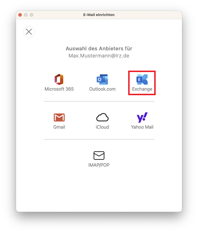 Der nebenstehende Screenshot des Einrichtungsassistenten ist vom neuen Outlook. Wenn Sie die Einrichtung in der Legacyversion von Outlook für Mac vornehmen können Sie die ersten Schritte überspringen.