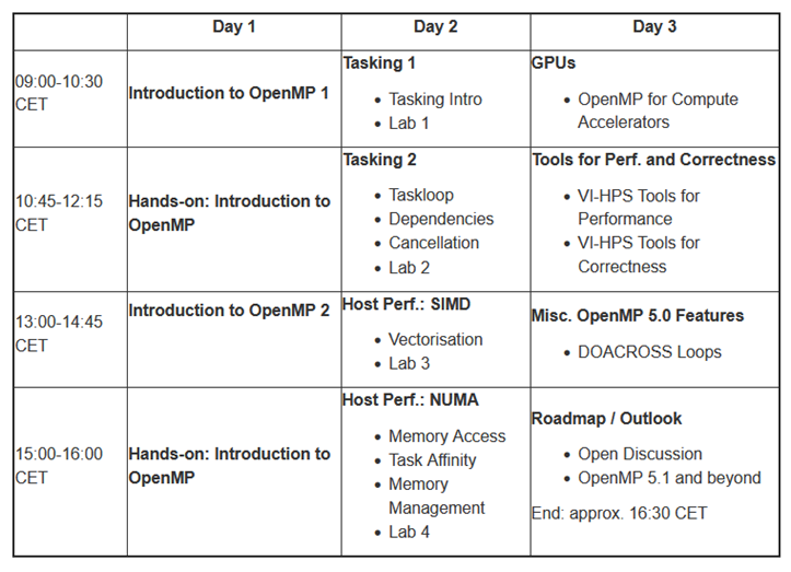This workshop will cover a wide range of topics, reaching from the basics of OpenMP programming using the "OpenMP Common Core" to really advanced topics. During each day lectures will be mixed with hands-on sessions.