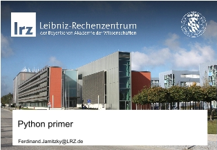 Using Python at LRZAs a general-purpose programming language with a growing user-base amongst data scientists, python is increasingly used for data analysis and machine learning applications at the Leibniz Supercomputing Centre (LRZ). In this half-day course several techniques and best practice examples will be demonstrated - empowering participants to use Python effectively on the LRZ Linux Cluster and the compute cloud. Topics covered: