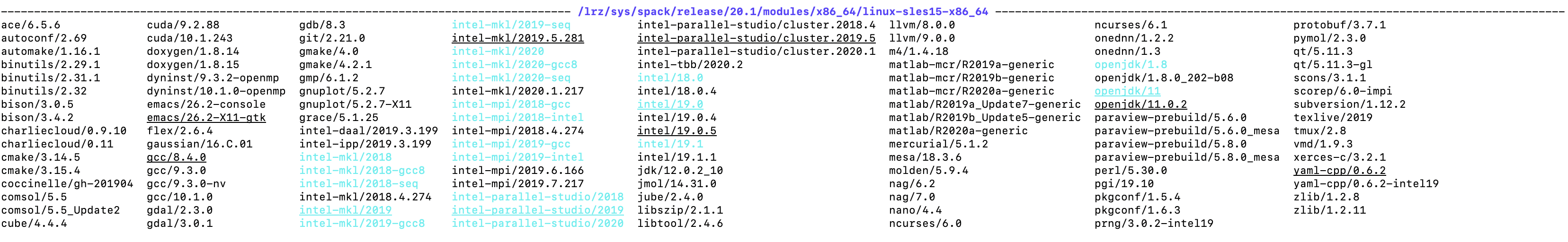 | Performance tools (advisor, inspector, itac, ...) Modules | intel-parallel-studio Note: You will need to unload the modules intel-mkl, intel-mpi, intel (in this order) to use it | devEnv/Intel/2019 |