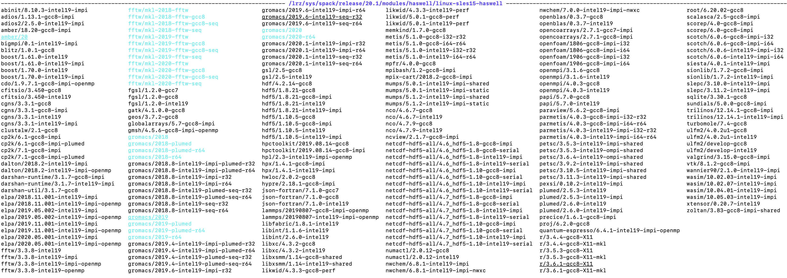 | Module Names | PACKAGE/version-compiler&version-othersuffixs Example: fgsl/1.2.0-gcc7 fgsl/1.2.0-gcc8 fgsl/1.2.0-intel19 - Generic installations for many packages are installed under the