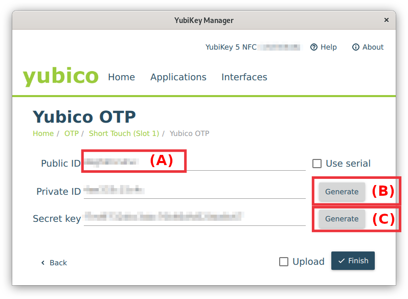$ ykman otp yubiotp --serial-public-id --generate-private-id --generate-key 1