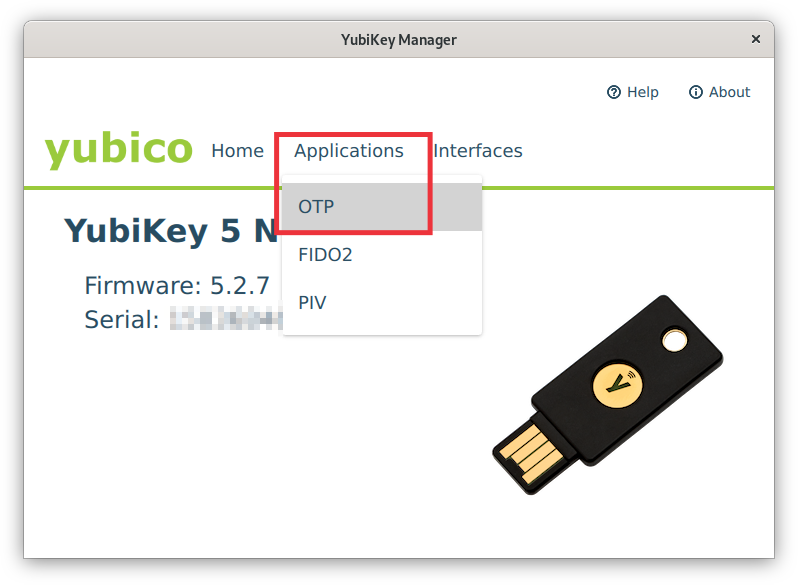 Connect the YubiKey to your computer and run the YubiKey Manager executable. The home screen of the program will show the hardware version of the YubiKey and its serial number (Fig. 1). |