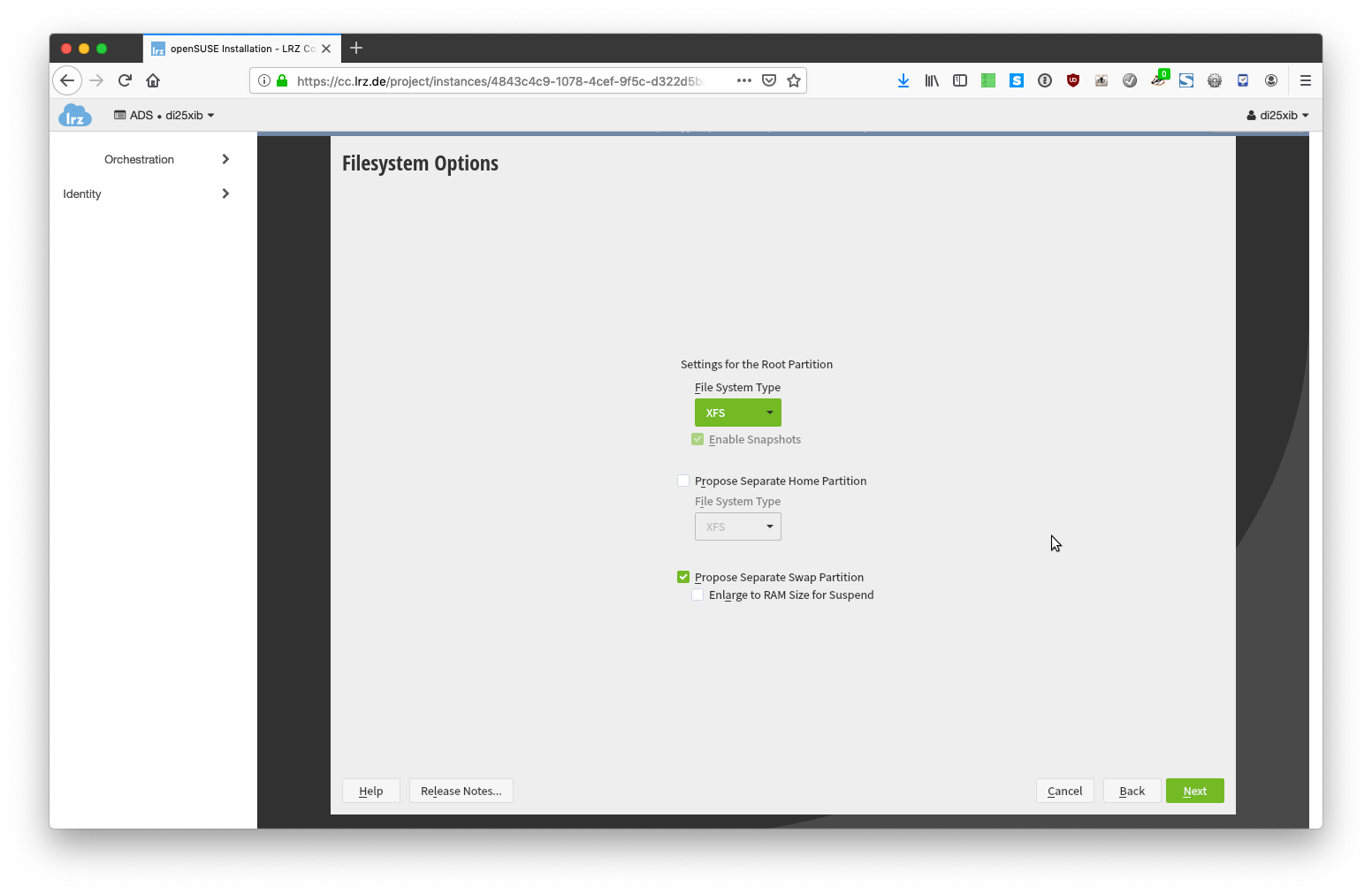 - By default openSUSE would use btrfs as main file system. I have changed this to XFS. A swap partition is also created by default. I did not disable it but you can to make better use of your volume space. Click on "Next".