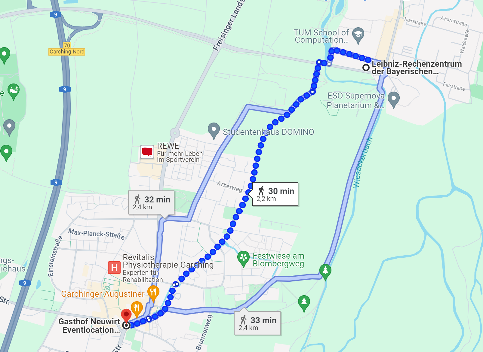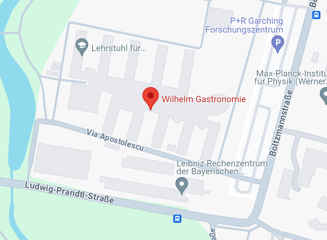 For coffee and lunch breaks we recommend the bistro, snack/coffee counter and coffee machines of Gastronomie Wilhelm in the TUM School of Computation, Information and Technology (CIT) building just next to the LRZ: