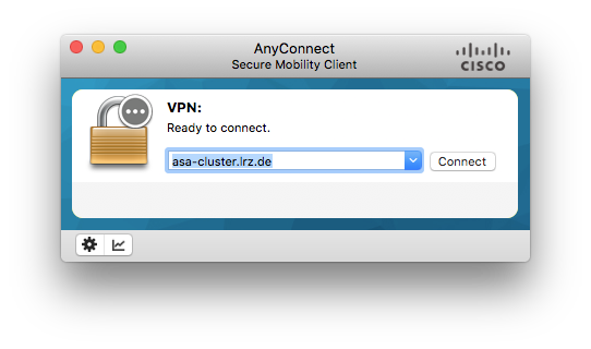 asa-cluster.lrz.deund nicht Ihren Benutzernamen ein. Der wird danach abgefragt - Dieser Vorgang muss nur einmal durchgeführt werden, danach rufen Sie das Programm Cisco AnyConnect Secure Mobility Client auf Ihrem Rechner auf.
