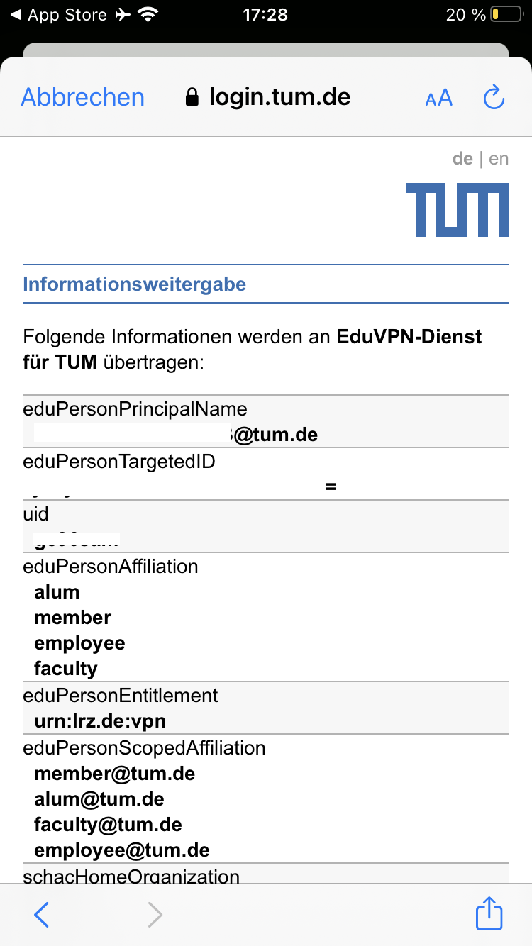 Ohne das Attribut eduPersonEntitlement urn:lrz.de:vpn können Sie VPN an der TUM und LMU nicht nutzen.