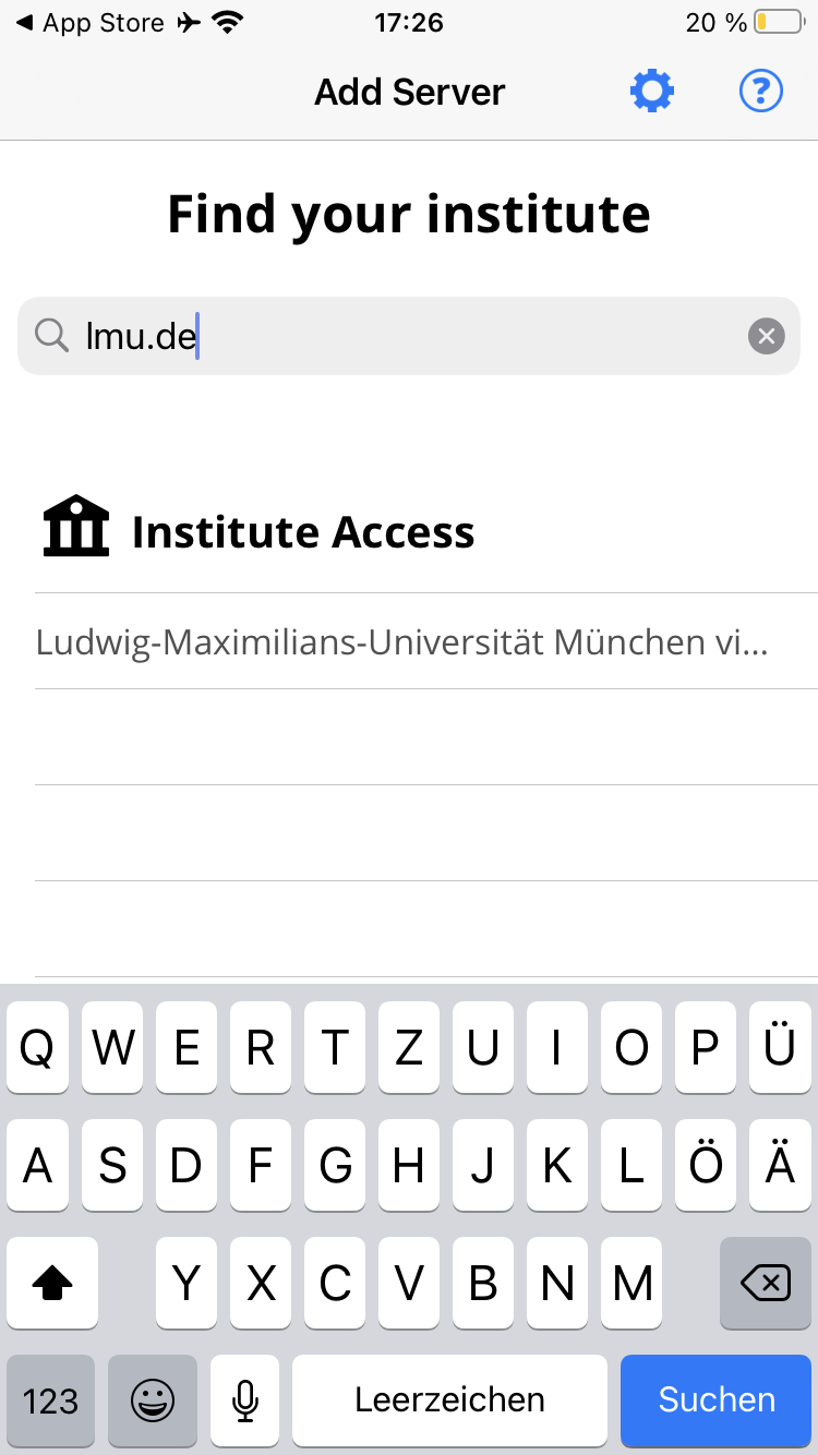 Nun wählen Sie je nach Angehörigkeit den richtigen Server, indem Sie einfach das entsprechende Schlüsselwort eintippen. Falls das nicht funktioniert, geben Sie bitte den Namen der Institution ein. Wichtig: Nehmen Sie den Eintrag, der unter Institute Access steht.