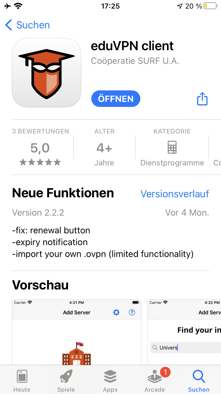 Im Appstore den eduVPN client suchen, installieren und öffnen: