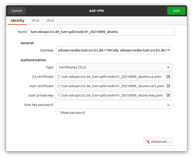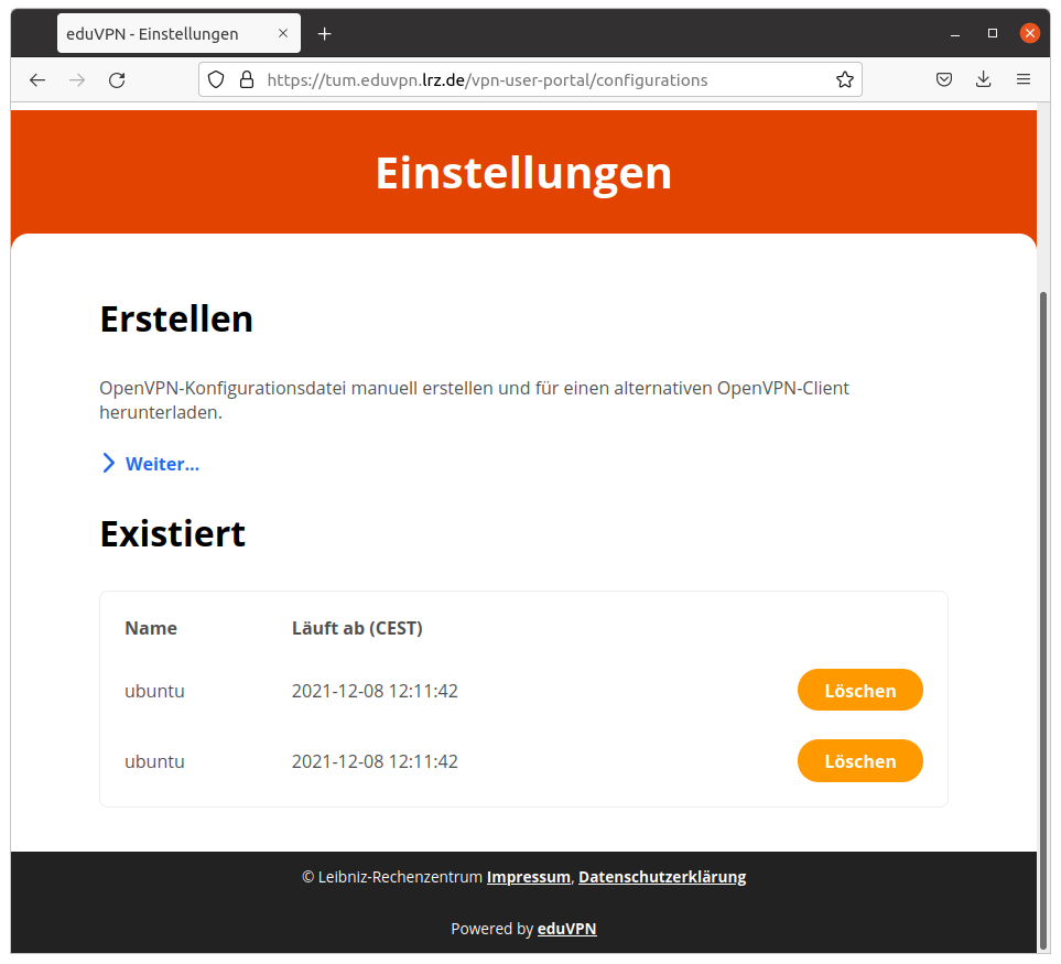 | Technische Universität München via LRZ-VPN | tum.de | VPN - eduVPN - Konfiguration für TUM | tum.eduvpn.lrz.de |