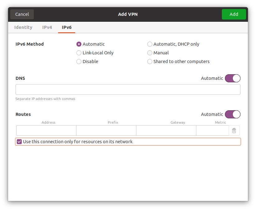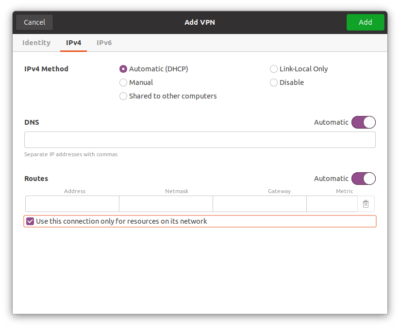 Das kann auch in den Einstellungen des Network Managers konfiguriert werden, idem sie bei [ipv4] und bei [ipv6] never-default=true einfügen. Anschließend aktivieren