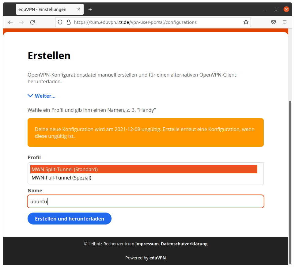 | Andere Einrichtungen mit VPN-Berechtigung | mwn.de | VPN - eduVPN - Konfiguration für andere Einrichtungen | rad.eduvpn.lrz.de |