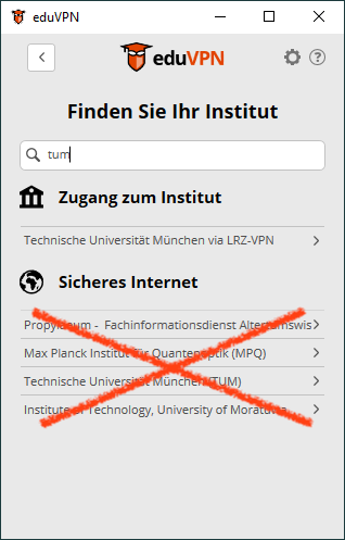 Wählen Sie nicht den Eintrag Technische Universität München (TUM) unter Sicheres Internet. Damit verbinden Sie sich mit den DFN-eduVPN Server ohne Zugang zum Münchener Wissenschaftsnetz.