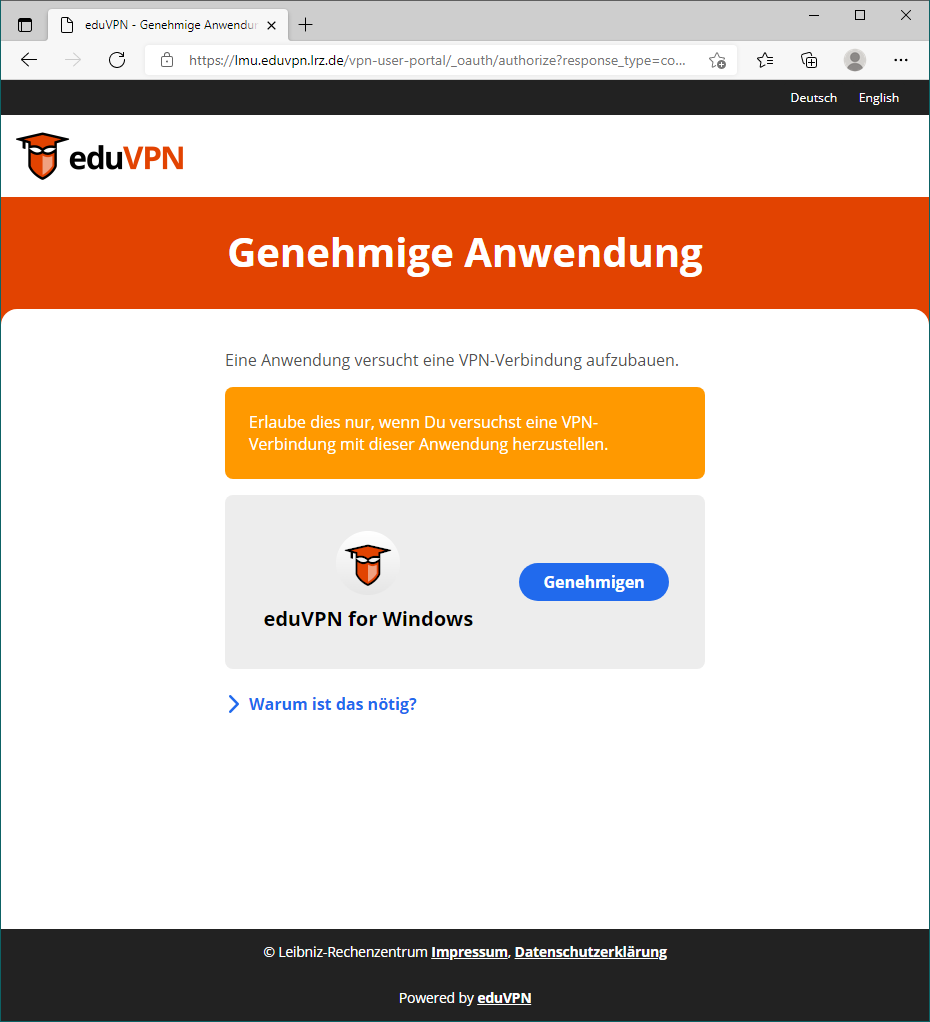 Dort müssen Sie den eduVPN-Client genehmigen (autorisieren).