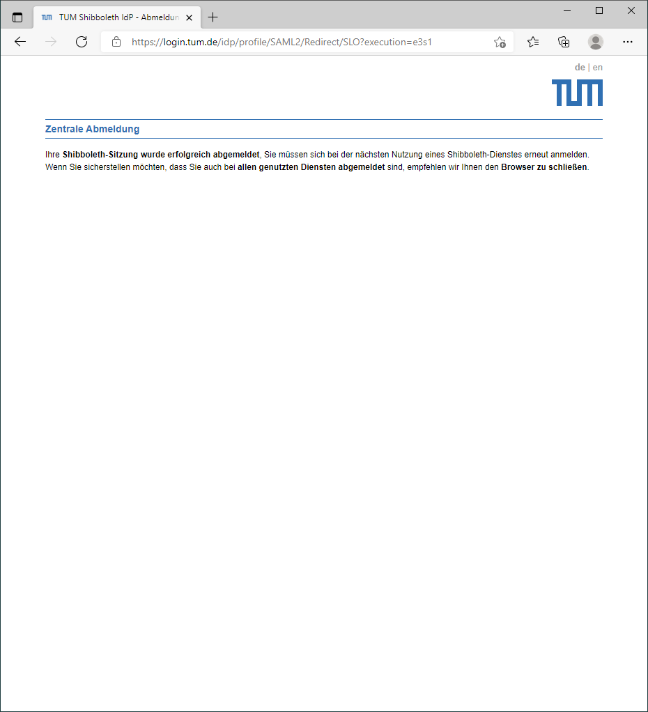 Wenn Sie sich abmelden, landen Sie zuerst wieder auf der Abmeldeseite der TUM und können dann das Fenster schließen