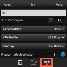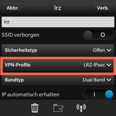 c) Hier unter „VPN-Profile“ das soeben erstellte anwählen, damit sich das BB10-Smartphone automatisch mit dem VPN verbindet, sobald es sich mit dem WLAN lrz verbunden hat
