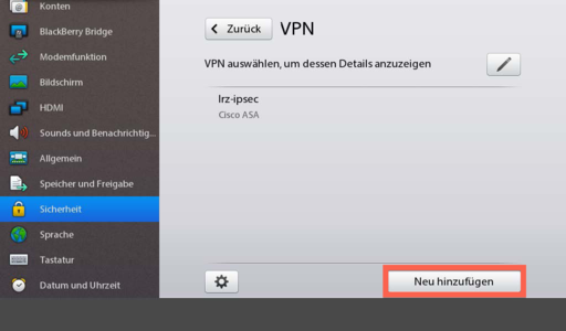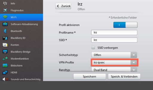 c. Hier unter „VPN-Profile“ das soeben erstellte anwählen, damit sich das Playbook automatisch mit dem VPN verbindet, sobald es sich mit dem WLAN lrz verbunden hat.