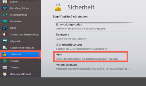 b) Im Einstellungsmenü auf den Punkt „Sicherheit“ und dort auf den Unterpunkt „VPN“