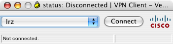 Nach der Installation befindet sich der Cisco VPN-Client im Ordner Programme. Durch Doppelklick wird der VPN-Client gestartet. Steht dort nicht der Eintrag lrz, dann muss das Profli lrz.pcf, das man auf der selben Seite wie den Client herunterladen kann noch installiert werden. Dazu erweitert man das Fenster des VPN-Client durch Drücken der Tastenkombination Befehlstaste + M. Nun kann man auf das Symbol Import klicken und die Datei lrz.pcf importieren. Nach erneutem Drücken von Befehlstaste + M sieht das Fenster wie unten abgebildet aus.