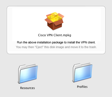 Ein Doppelklick darauf öffnet ein Fenster in dem sich das Installationsprogramm (Cisco VPN Client.mpkg) und zwei Ordner befinden. Ein Doppelklick auf Cisco VPN Client.mpkg startet die Installation. Nach der Installation kann das Disk Image ausgeworfen und die .dmg Datei gelöscht werden."