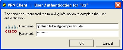 Start->Programme->LRZ VPN Client->VPN Client. Im Programmfenster
