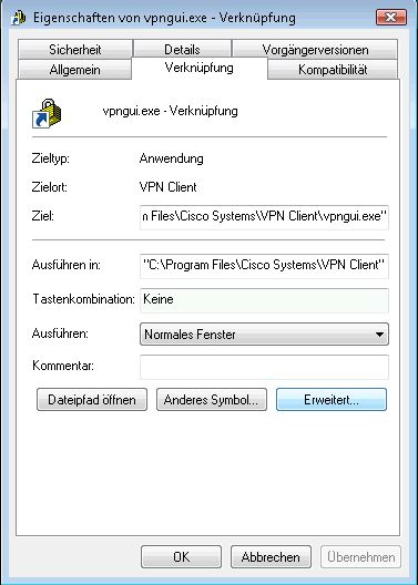 Nun kann man das Explorerfenster schließen. Auf dem Desktop klickt man die Verknüpfung von vpngui.exe an und wählt die Option "Eigenschaften" . Es erscheint ein weiteres Fenster. Dort klickt man im Reiter "Verknüpfung" auf "Erweitert".