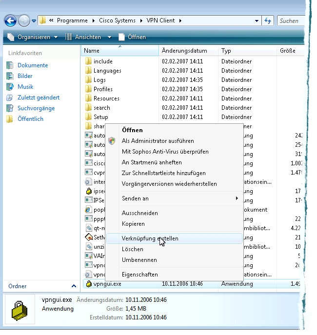 Der fertig installierte Client muss als Administrator gestartet werden. Um diesen Schritt zu vereinfachen legt man eine Verknüpfung auf dem Desktop an. Dazu öffnet man im Explorer das Verzeichnis "C:\Programme\Cisco Systems\VPN Client", klickt dort das Programm "vpngui.exe" mit der rechten Maustaste an und wählt die Option "Verknüpfung erstellen".