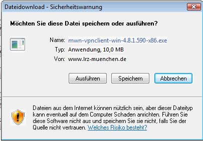Der VPN-Client kann unter folgendem Link heruntergeladen werden:https://www.lrz.de/cgi/netz/vpnclient/vpnclient. Es kann dabei zu einer Sichertsheitsabfrage des Browsers kommen, wenn die DFN- und LRZ-Zertifikate nicht importiert sind. (siehe auch: http://www.lrz.de/fragen/faq/sicherheit2/)
