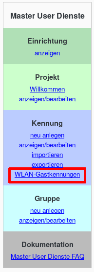 Gästen, die keine Campus-Kennung erhalten, soll der Zugang zu eduroam gewährt werden.  Die Möglichkeit, WLAN-Gastkennungen im LRZ IDM-Portal anzulegen, bleibt für den Master User auch in Projekten mit Kennungsimport bestehen (siehe nebenstehenden Screenshot).