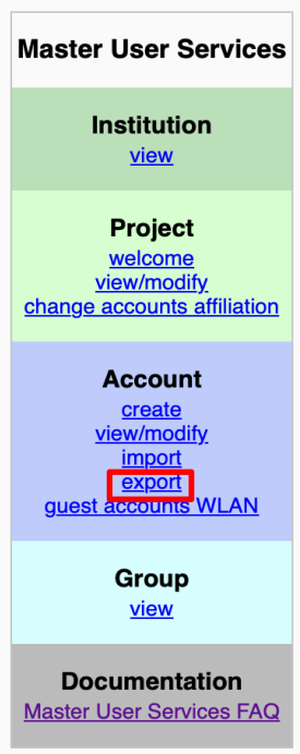 - When exporting, all basic services assigned by LMU to an account are retained (i.e. ADS, CampusLMU mail, Confluence, GitLab, Institutional Cloud Storage, Personal Cloud Storage, Sync+Share, VPN / WLAN, lmu.de mail forwarding, if available in each case).