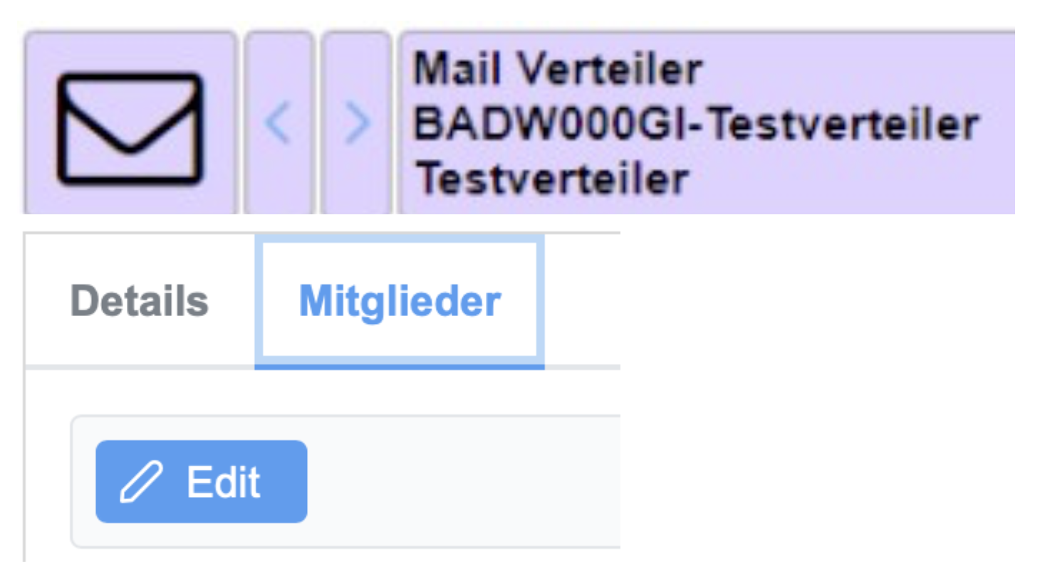 The members of a distribution list are managed in the same way as any normal AD group. To do this, go to the distribution list, switch to the tab "Members (Mitglieder)" and click on "Edit".