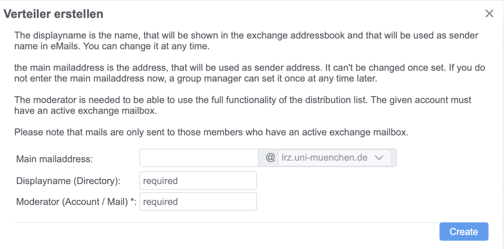 Fill in the necessary fields in the "Verteiler erstellen (Create Distribution List)" dialogue and click on "Create".