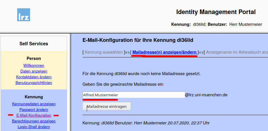 Hauptmailadresse eintippen und "Mailadresse eintragen" anklicken - Ggf. die zuvor von der LRZ-Kennung gelöschten Mail-Aliase hier wieder eintragen